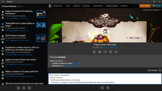 Baconit is probably the most popular Reddit client for Windows. There’s plenty to love about it. Baconit has a dynamic and modern-looking UI and comes with all of the features available on Reddit online.