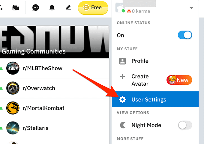 - On Reddit, select your profile icon at the top-right corner and select User Settings from the menu.