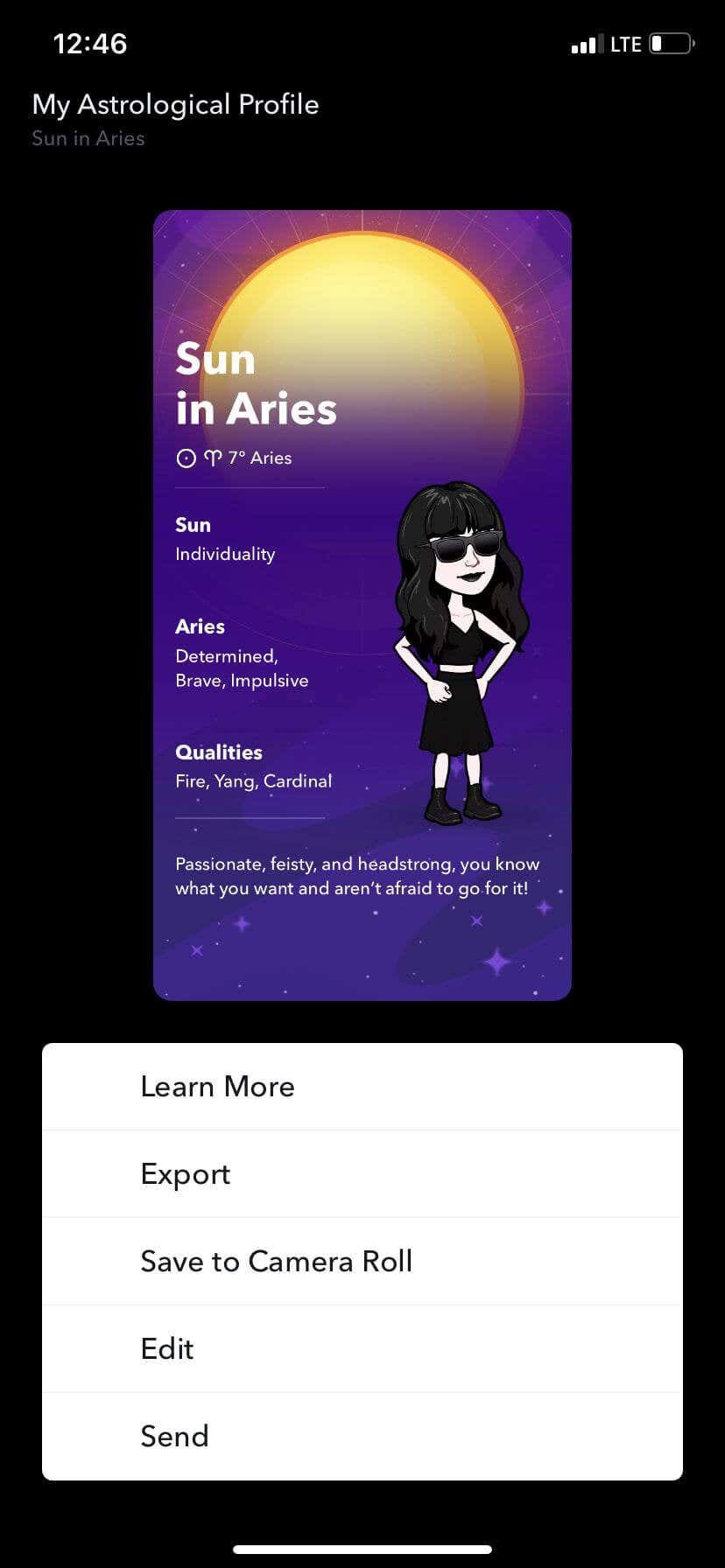 - You can tap on the three dots in the top right to either learn more about the Astrological profile feature, export a slide in your profile, save it to your camera roll, edit it, or send it to a friend or social media.