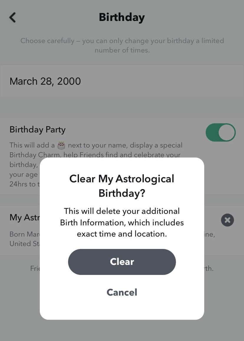 - In the pop-up window, select Clear. This will remove your Astrological profile.