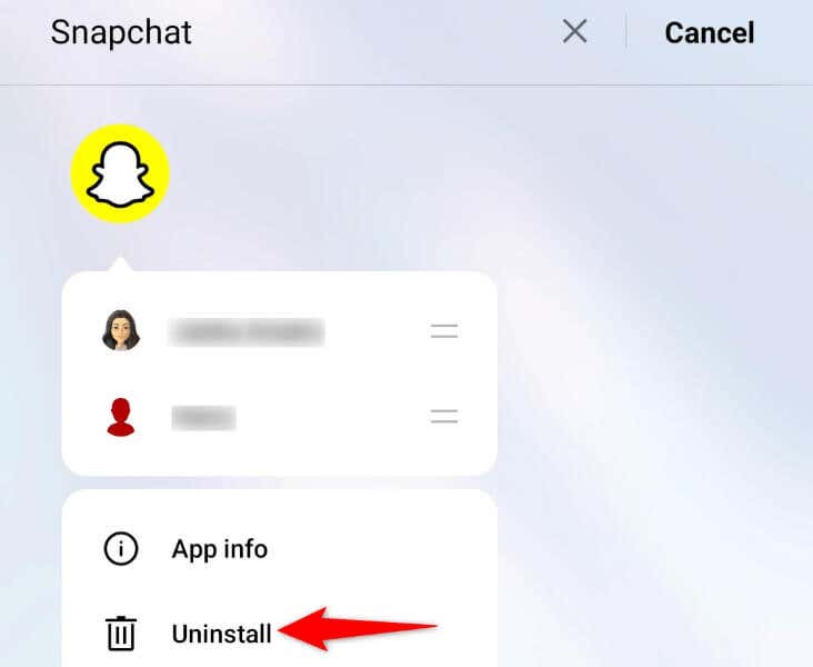 - Tap and hold on Snapchat in your app drawer and select Uninstall.