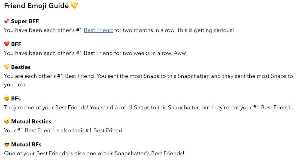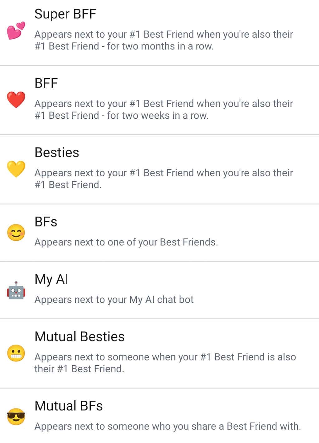 There are Snapchat friend emojis for mutual bfs, super bffs, and mutual besties, as well as Snapstreak emojis which indicate your Snapchat streak is ending soon, like an hourglass or a fire emoji. You can find a full list of emojis which you can come across on Snapchat in our comprehensive Snapchat emoji guide.