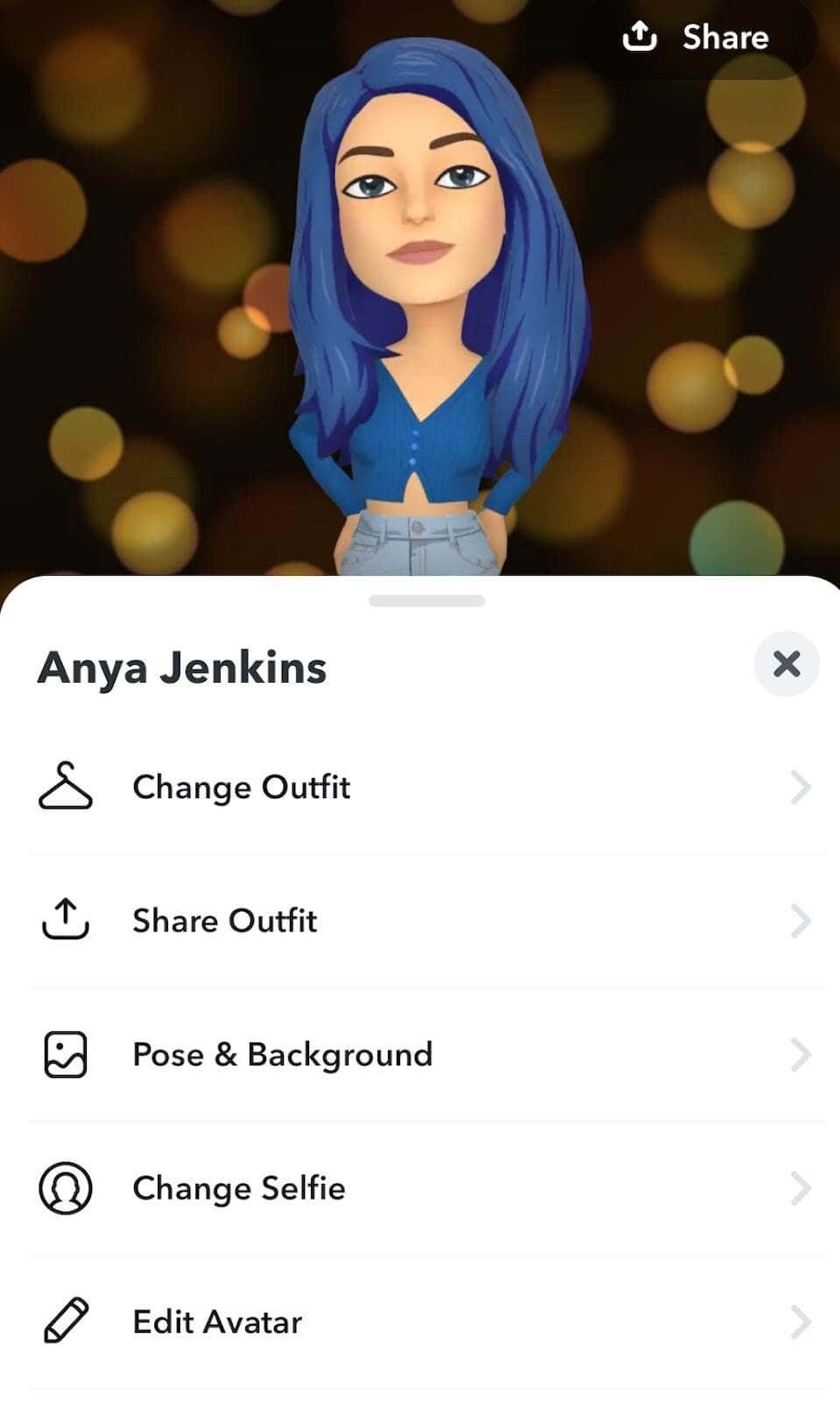 You can customize your Bitmoji in your profile settings. If you don’t have a Bitmoji yet, select Create Bitmoji. Otherwise, select your Bitmoji icon and choose one of the customization options: Change Outfit, Pose & Background, Change Selfie, or Edit Avatar.