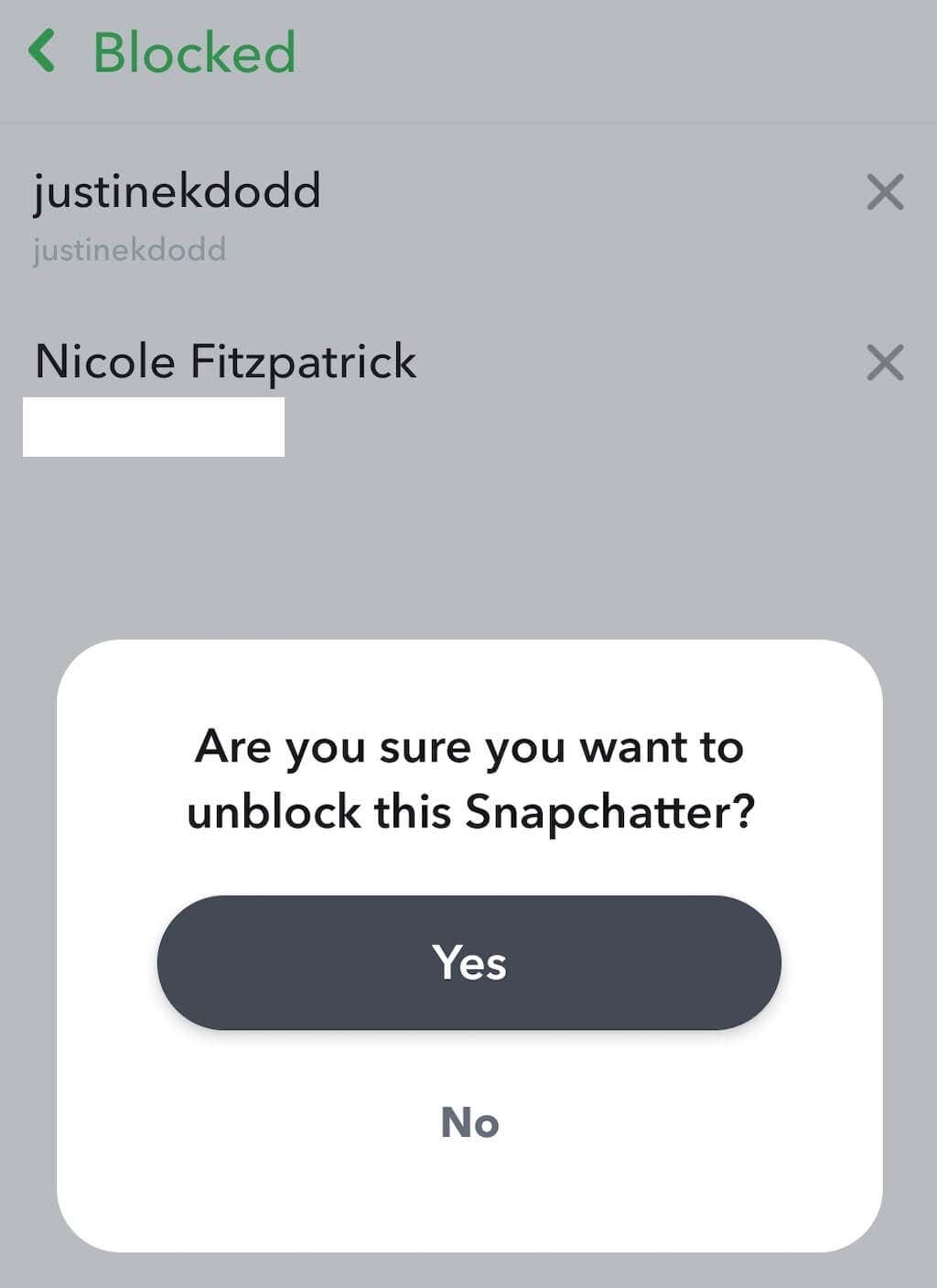 - Snapchat will prompt you to confirm your action. Select Yes to unblock this person.