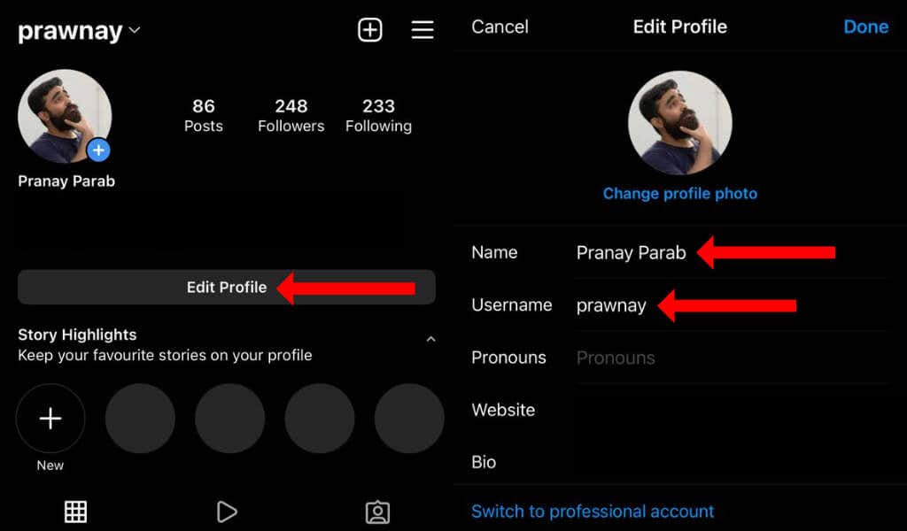 Once you’ve done that, tap the profile icon in the bottom-right corner of the homepage on the Instagram app. Now tap Edit Profile, which is above your story highlights. You can use the Name field to change your Instagram name. The Username field will show your current username on Instagram. You can change this to your desired username and tap Done to save these changes.