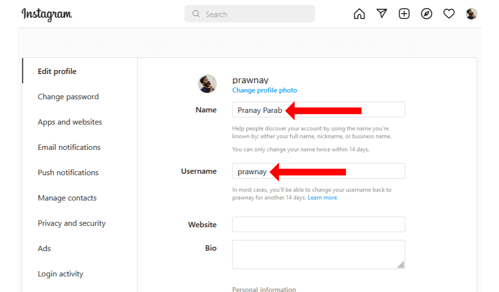 You can now click the form next to the Name field and type the new name you want to use. Similarly, you can click the box next to the Username field and change your username. Changing your username will change your profile’s URL too.