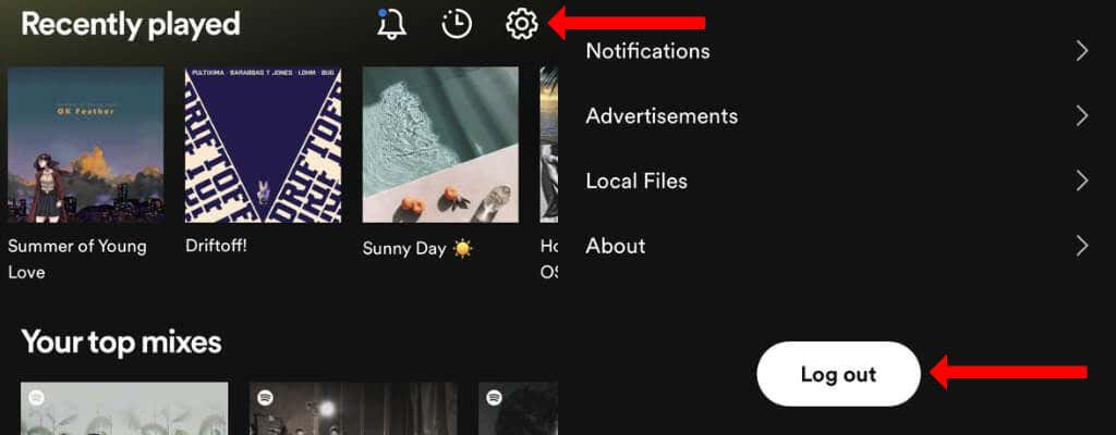To log out, open Spotify’s Android app and go to the homepage. Click the gear icon in the top-right corner to open Spotify settings. Scroll to the bottom and tap Log Out.