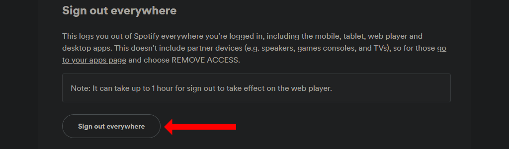 Spotify notes that it’ll take up to an hour to sign you out of the web player. This includes your web browser, the iPhone app, the Android app, and all desktop apps.
