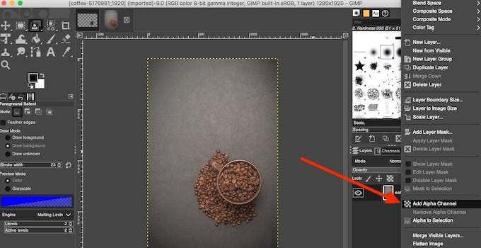 - In the lower-right corner of your screen, select your image layer. Right-click it and select Add Alpha Channel. This will ensure that you delete the background to transparent and not to white or black color. If the option to Add Alpha Channel is greyed out, then your image already has it and you’re good to go.