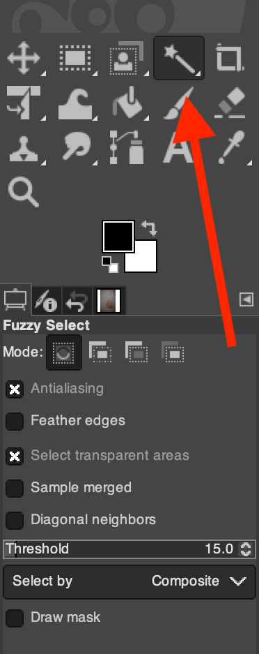 - Select the Fuzzy Select tool from the tools panel in the upper-left corner of the screen.