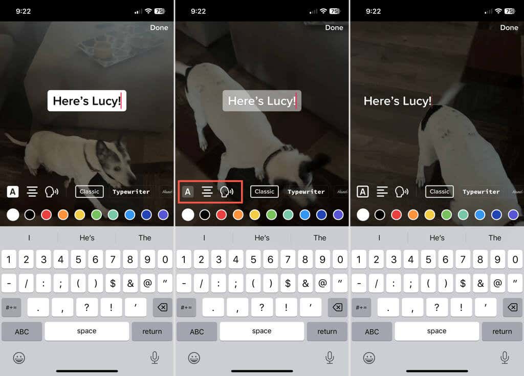 - You’ll then see the customization options along with your keyboard. Type the text you want to add so that you can preview the customizations you choose. The text appears as an overlay on your video.
