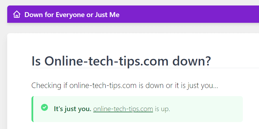 You can check if your site is facing an outage by using an online tool like DownForEveryoneOrJustMe. Open this site in your web browser, enter your web page’s link, and the site will tell you whether your page is up or down.