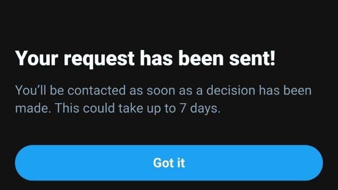 Twitter promises to give you a response in 7 days or fewer, but you’ll see the verification badge next to your Twitter name as soon as it’s approved. If you get rejected, Twitter will send you a message to that effect.