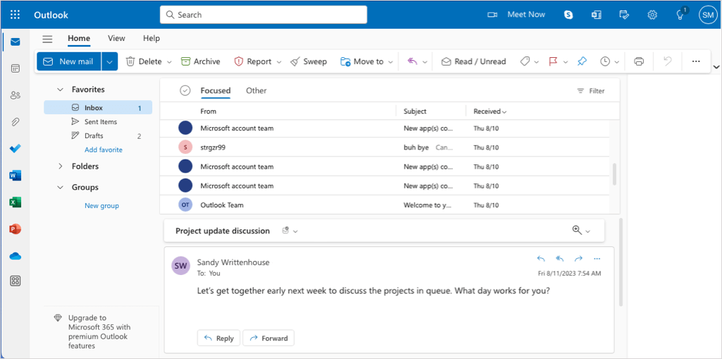 You don’t have to be limited to a desktop email application just because you want to use Outlook instead of Gmail. Microsoft provides a web-based Outlook option at no charge, and you can log in with your existing Microsoft account.