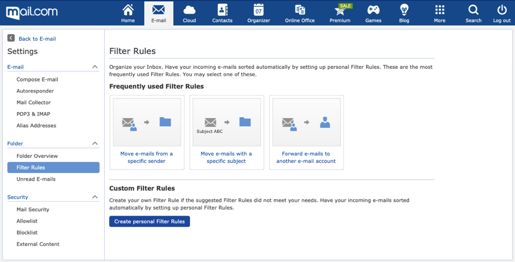 Whether you currently use or have previously used Yahoo or AOL for email, you’ll get the same familiar feel with Mail.com. Once you create your account and log in, you’ll see a handy list of services along the top of your personalized page.