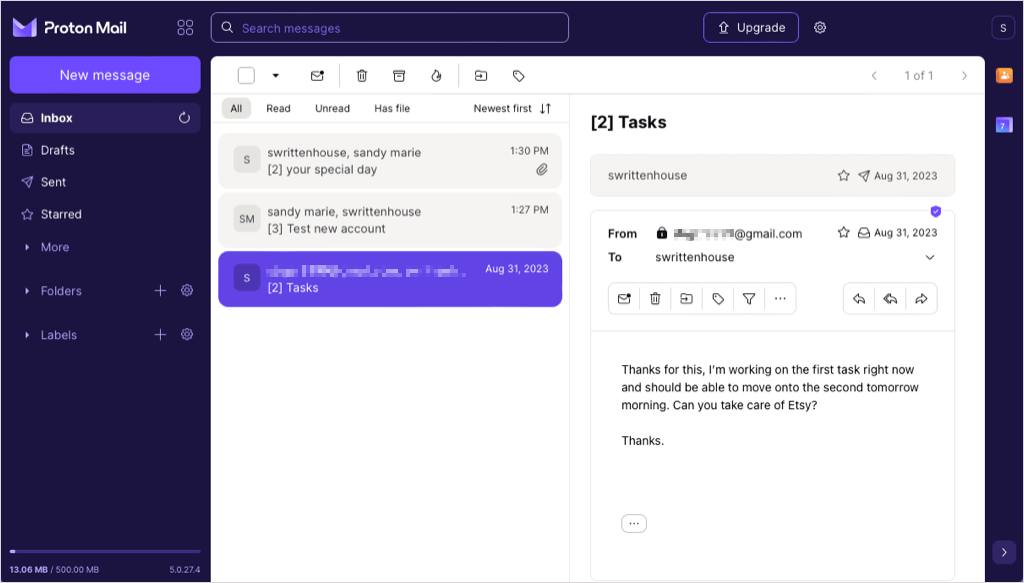 Proton Mail is available for free with paid subscription plans for extra features like unlimited messages per day, a custom email domain, 15 GB of storage, unlimited folders, and more. Plans start at $3.49 per month.