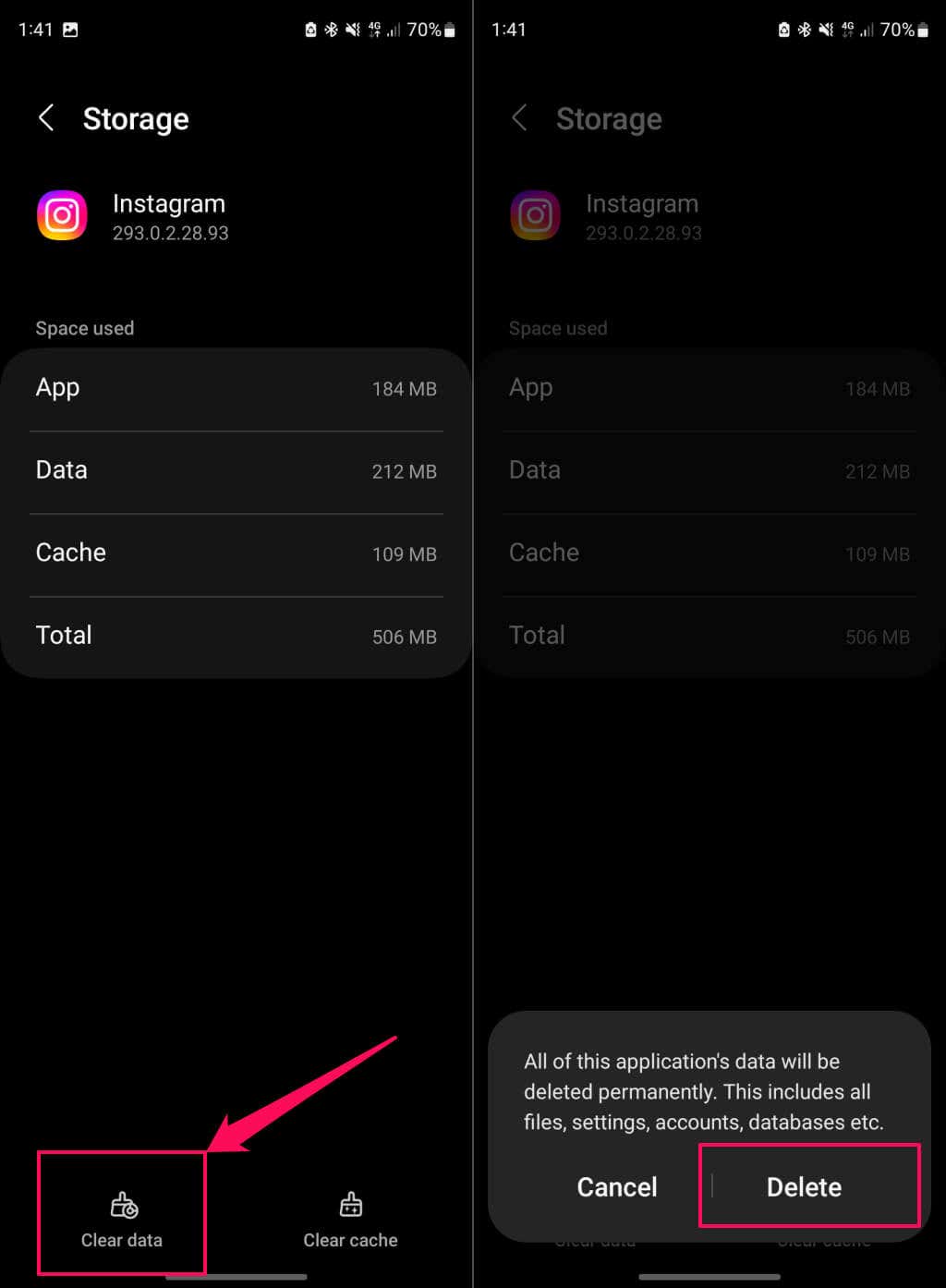 - Tap the Clear cache icon to delete Instagram’s cache files on your device.