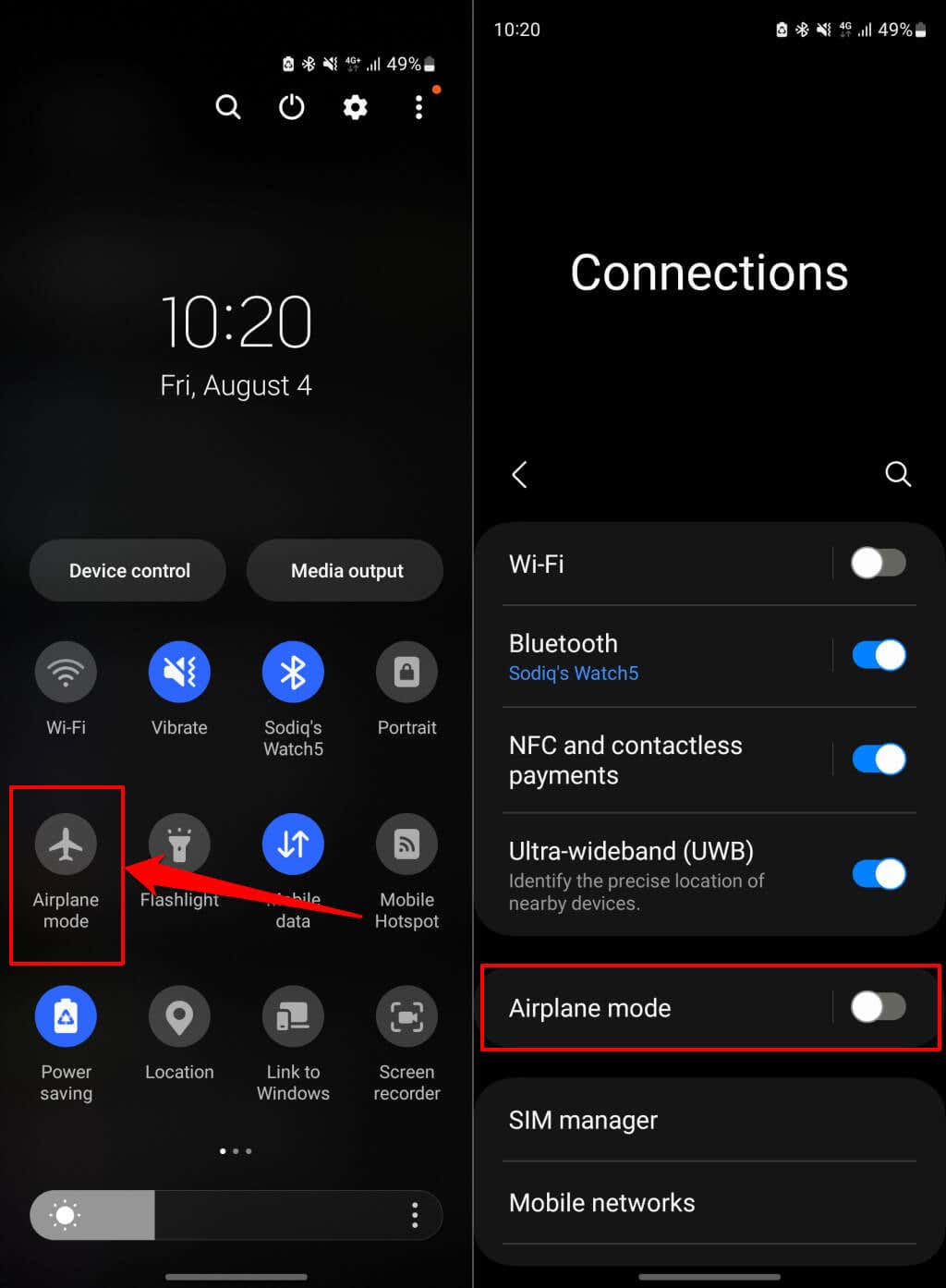 Swipe up from the top of your Android device’s screen and tap the airplane icon to enable airplane mode. Wait 3-5 seconds and tap the icon again to turn off airplane mode.