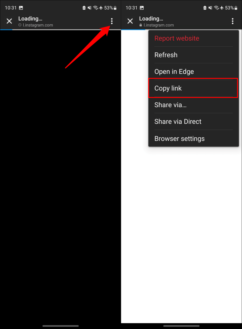You can also copy Instagram links and open them in your preferred (external) browser. Tap the menu icon in the Instagram browser and select Copy link. Paste the copied link in your preferred browser to visit the website.