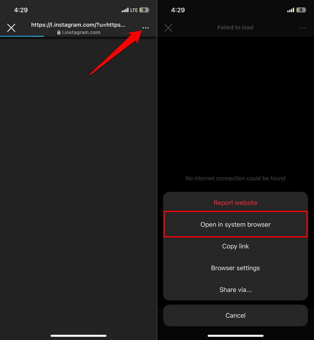 In the iOS Instagram app, tap the three-dot menu icon in the top-right corner, and select Open in system browser.