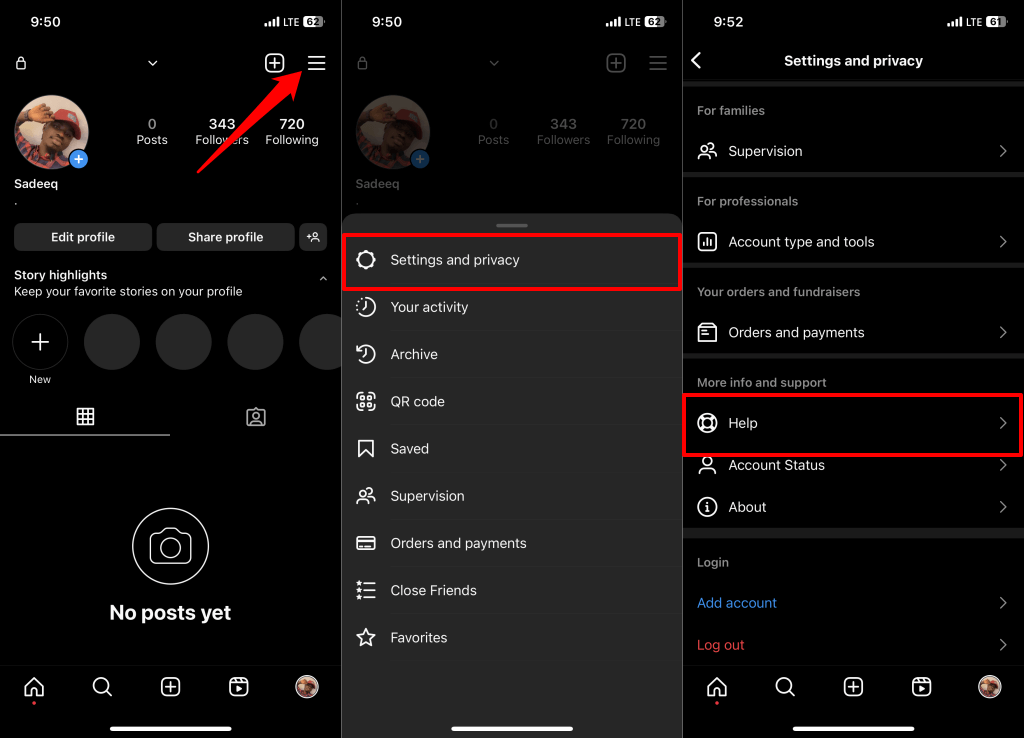 - Tap the hamburger menu icon in the top-right corner and select Settings and privacy.