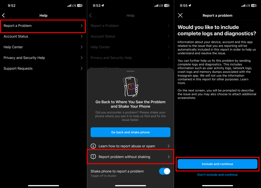 - Tap Include and continue to include information about your device, account activity, and network logs in the report. Otherwise, select Don’t include and continue to proceed.