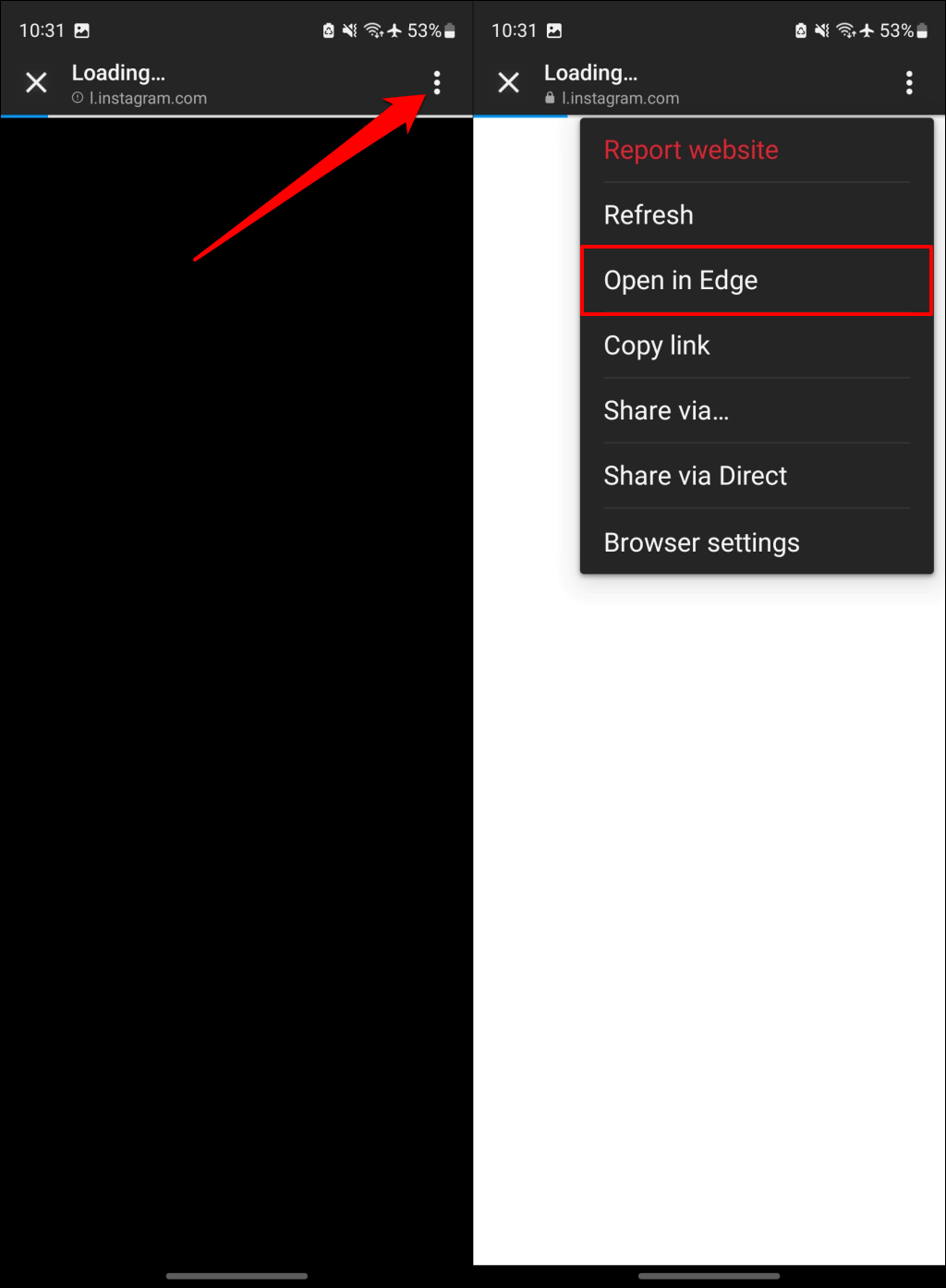 On Instagram for Android, tap the three-dot menu icon in the top-right corner, and select Open in [Browser Name].
