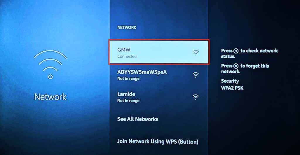 Go to Settings > Network, navigate to the internet network, and press the Pause/Play button on your Fire TV Remote.