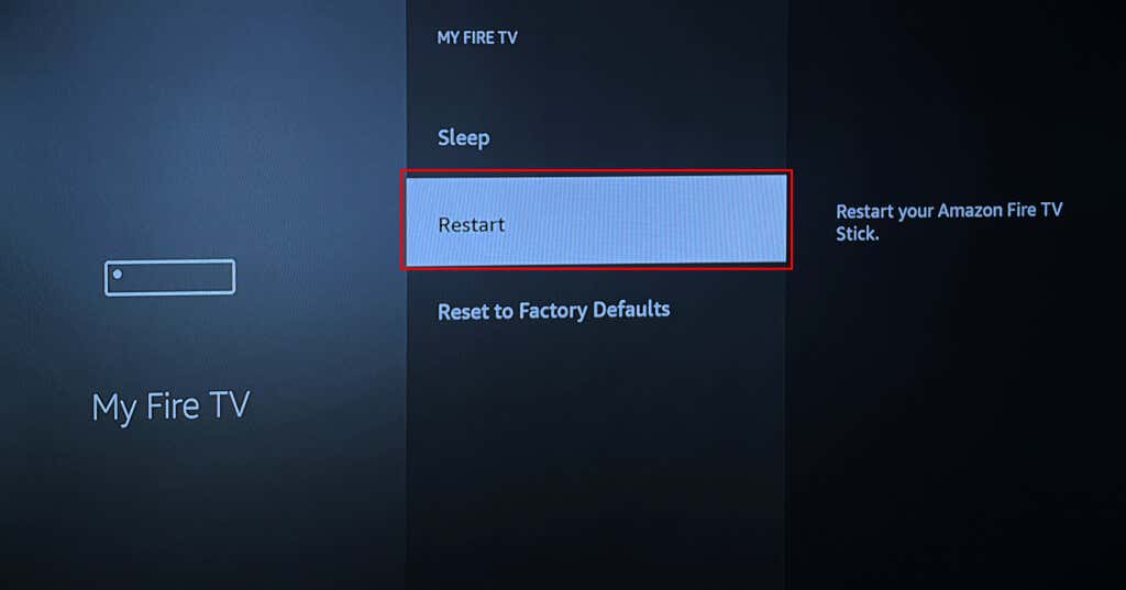 Head to Settings > My Fire TV, select Restart, and wait for your Fire TV to reboot.