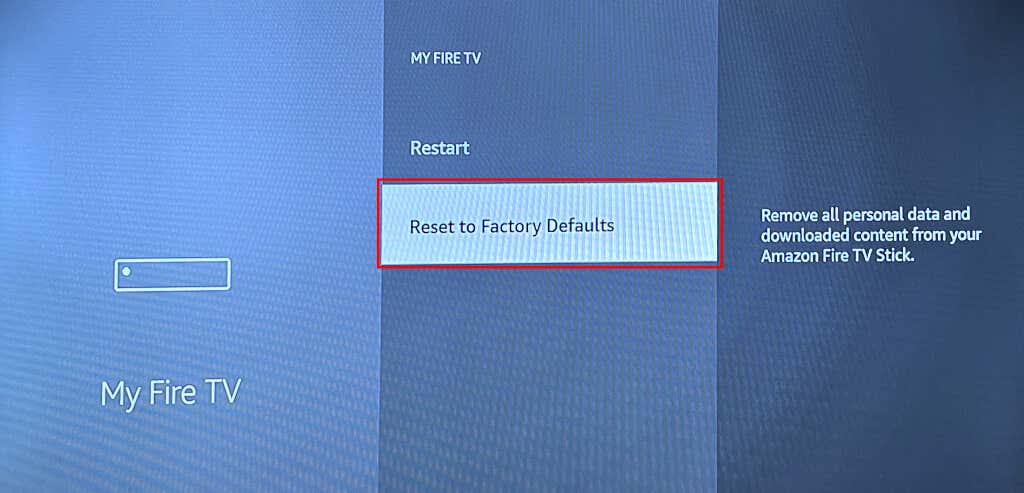 Reset your Fire TV to factory default if you still can’t update the software on the streaming device. Note that performing a factory reset deletes your account information and downloaded content (apps, in-app purchases, etc.) on your Fire TV.