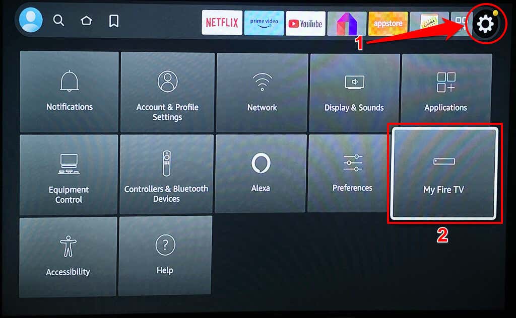 - Select the gear icon in the top-right corner of your Fire TV home screen.