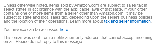 There’s another easy way to quickly access and print a receipt or invoice from an Amazon purchase. Deep in the fine print at the bottom of every Amazon shipping confirmation email is a link straight to that order’s invoice.