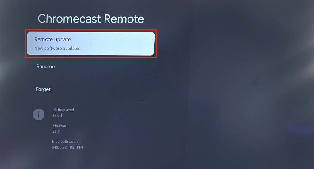 - If there’s an “Update available” message below your Chromecast Remote, select the remote to install the update.