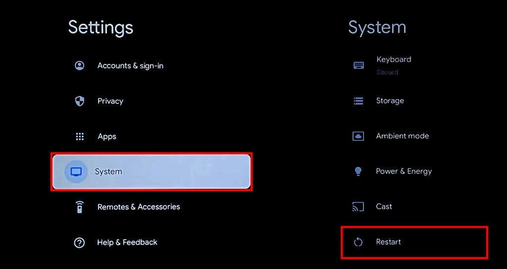 Performing a system reboot can fix glitches with your Chromecast and Chromecast Voice Remote. You can reboot your Chromecast from the Google TV settings or by reconnecting the streaming device to its power source.