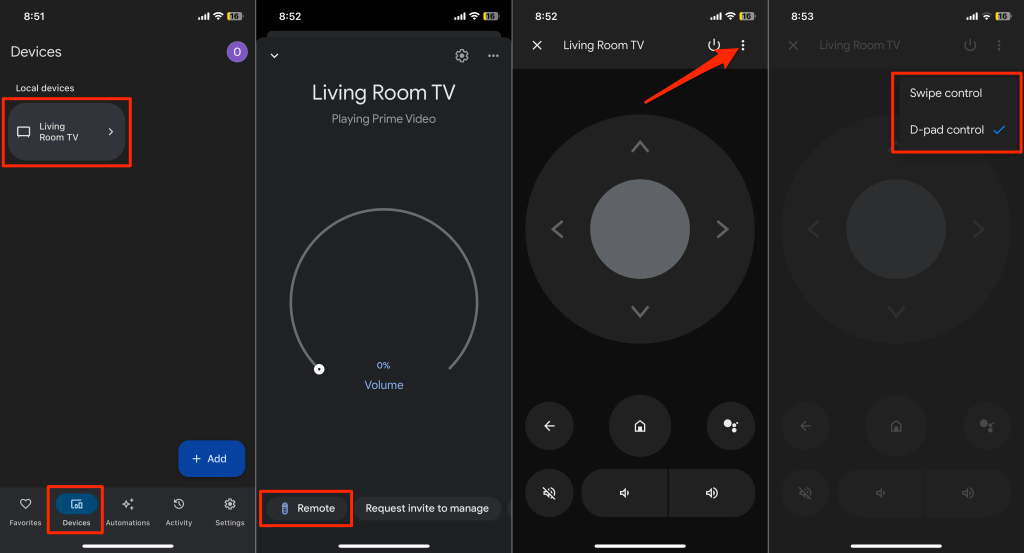 You can customize the virtual remote to use Swipe or D-pad navigation control. Tap the three-dot menu icon in the top-right corner and select Swipe control or D-pad control.