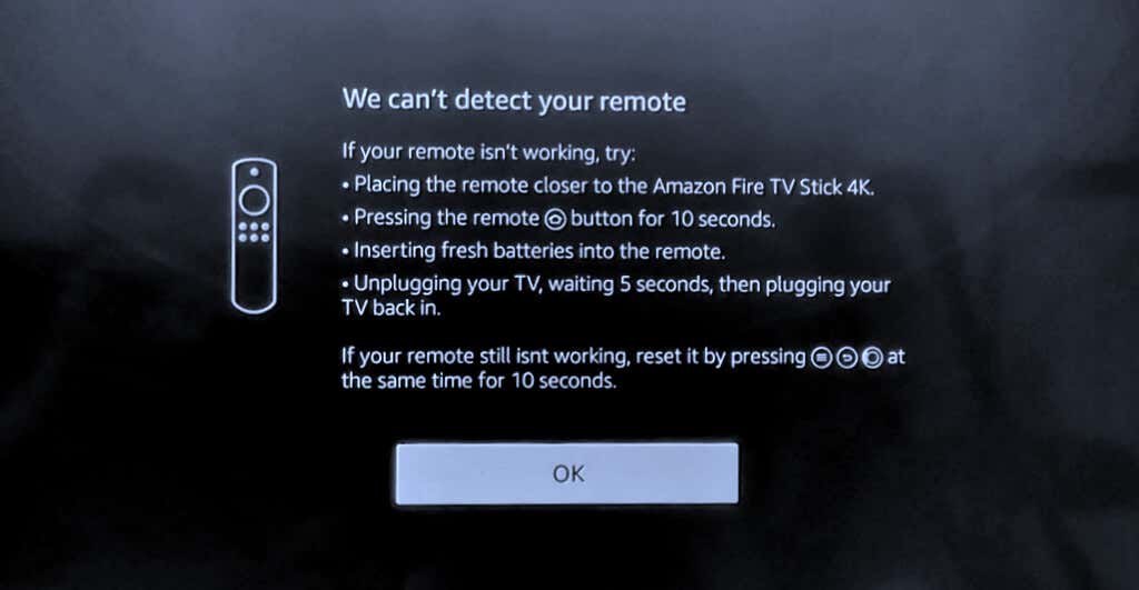 - Reinsert the batteries in the remote when you see a screen that says the Fire TV can’t detect your remote.