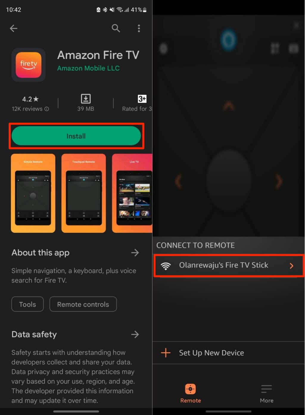 - Open the Amazon Fire TV app and wait for it to detect your Fire TV device. Select your device in the “Connect to Remote” section to proceed.