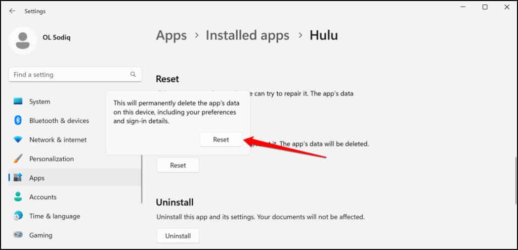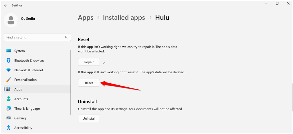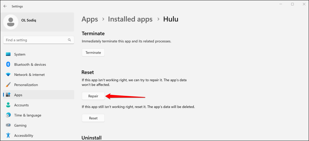 Windows PCs have a built-in repair tool that fixes programs that aren’t running correctly. Force quit Hulu and run the repair operation in the Windows app settings menu.