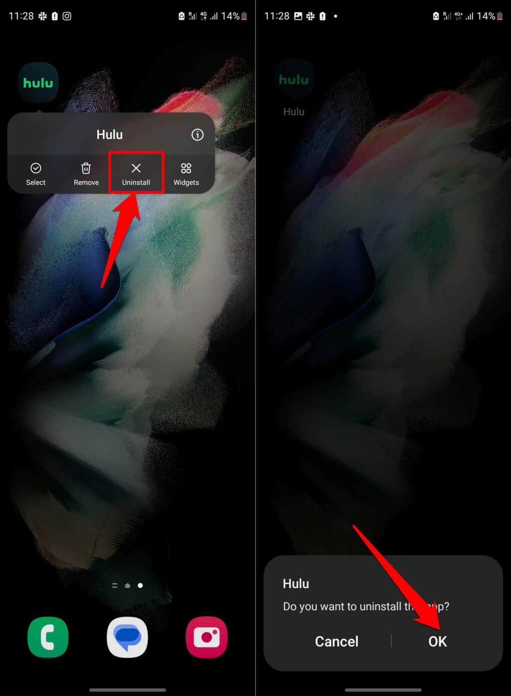 Long-press the Hulu app on your Android device, select Uninstall to delete the app and tap OK.