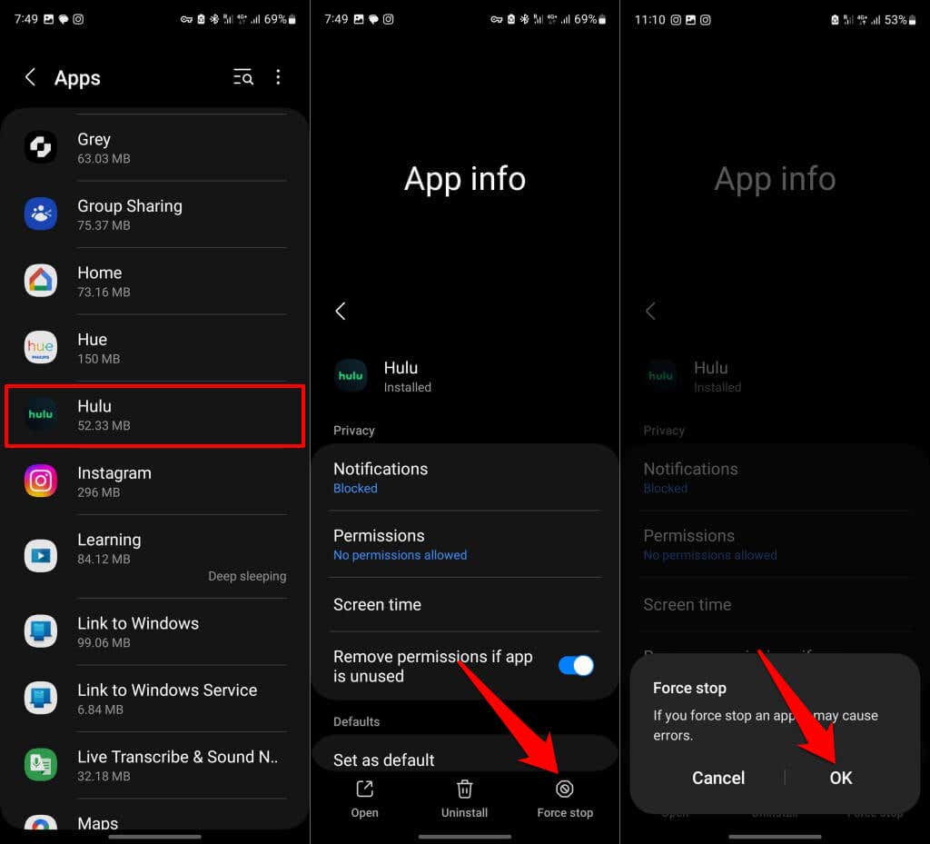 If you use an Android phone, go to Settings > Apps & notifications (or Apps) > See All Apps (or App info) Hulu and tap Force stop. Afterward, tap OK on the pop-up to force quit the application.
