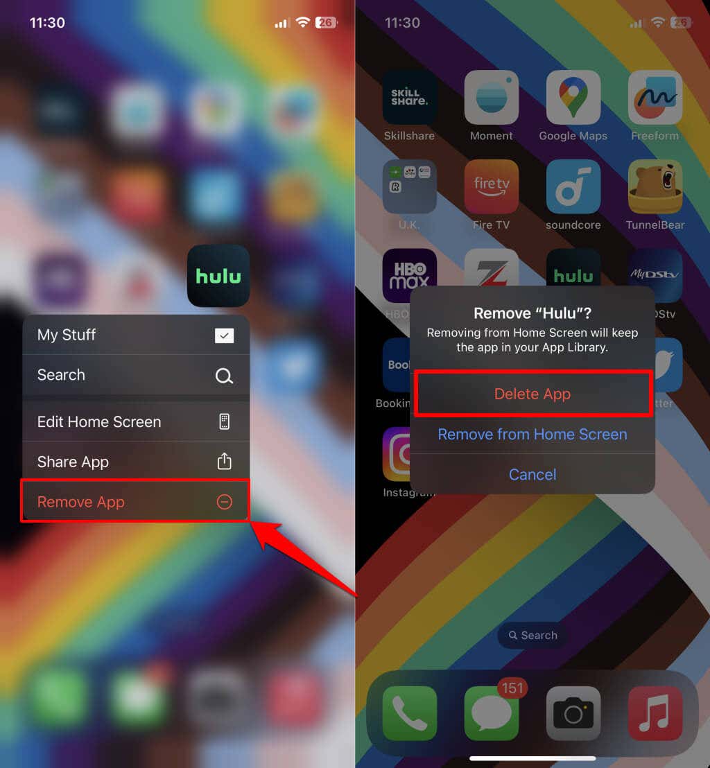 Press and hold the Hulu app icon on iPhone or iPad, tap Remove App, and select Delete App on the pop-up.