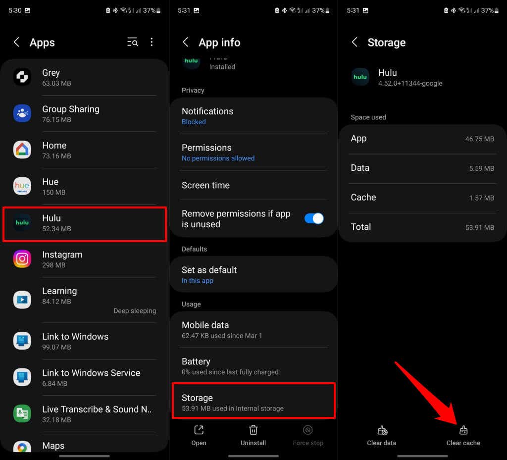 Reopen Hulu and check if clearing the app cache resolves the issues. Clear the app’s data (see the next step) if the Hulu error code 2(-0998) persists.