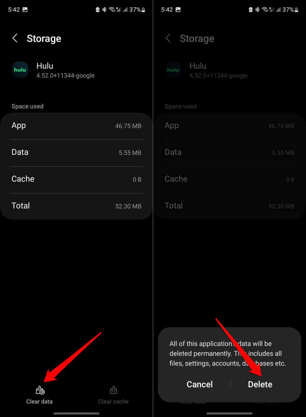 - Return to Hulu’s app info page (see steps #1 and #2) and select Clear Data (or Clear Storage). Select OK or Delete on the confirmation pop-up to proceed.