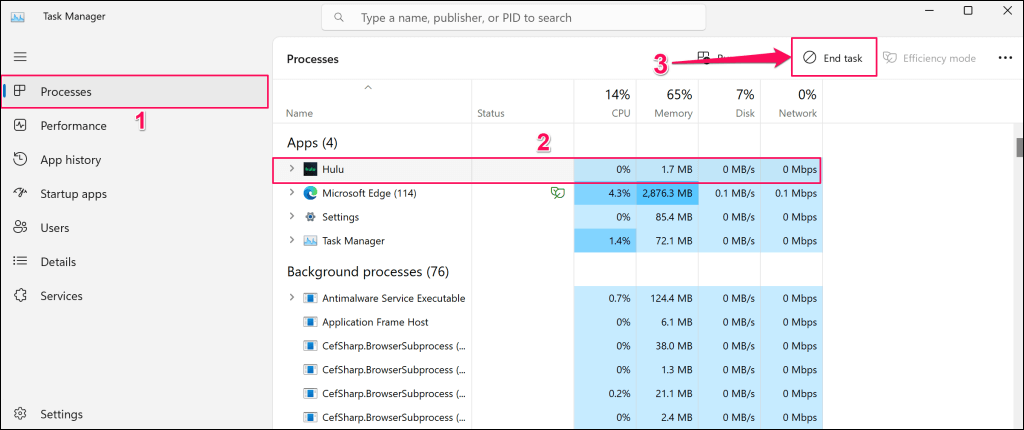 - Select the Processes tab on the left sidebar and select Hulu in the “Apps” section.