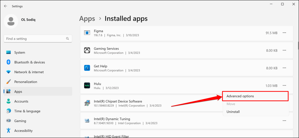 - Next, open the Windows Settings app, go to Apps > Installed apps, select the three-dot menu icon next to Hulu, and choose Advanced options.