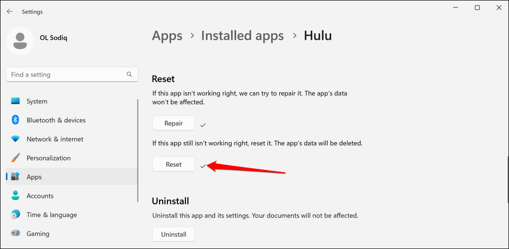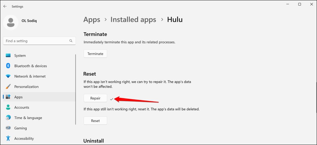 - Wait for Windows to complete the repair operation and launch Hulu when a checkmark appears next to the Repair button.