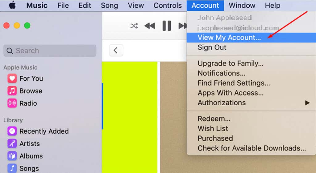 1. Go to iTunes and select the Account menu.