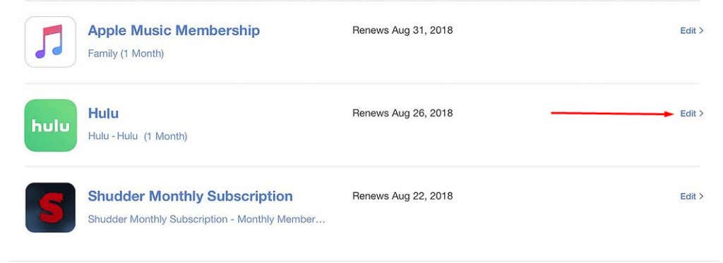 4. Find Hulu and select Edit. You’ll be taken to a page where you can cancel your subscription.
