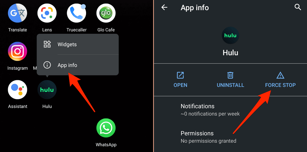 On Android phones and tablets, long-press the Hulu app icon, select the info icon, tap Force Close and select OK on the confirmation prompt.
