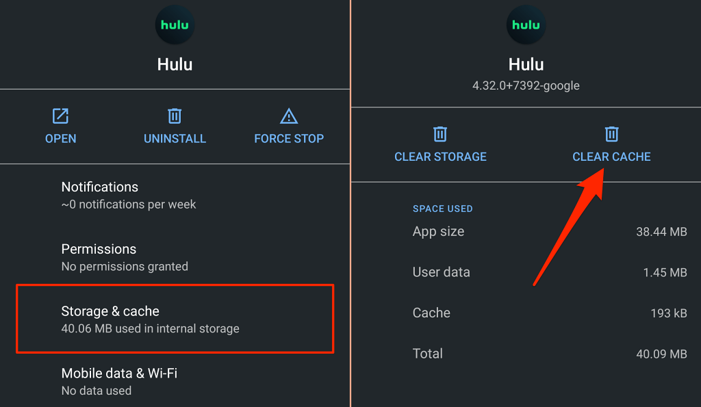 Tap Open to relaunch Hulu. If the error message persists, return to the app info page, select Storage & cache, and tap Clear Cache to delete the app’s temporary files.